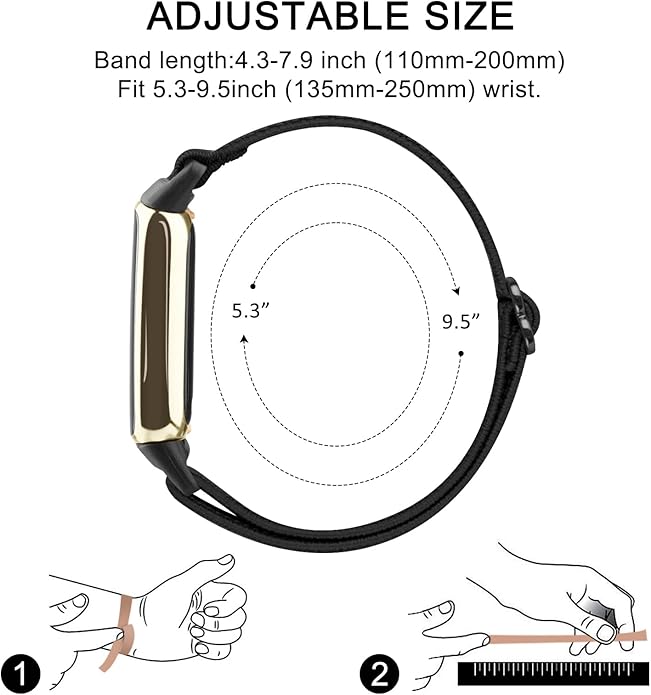 - Adjustable Size--We use the latest elastic luxe band and an adjustable buckle design allows you to adjust the size of the loop to your liking. You don't need to worry about buying wrong size. the wristband sizes fit 5.3in-9.5in (135mm-250mm) wrists. Free size for both women and man in most occasions.
