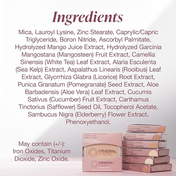 - PRESSED POWDER FOUNDATION: Preserve your naturally glowing complexion with the Mineral Fusion Powder Foundation. This makeup foundation is triple-milled for a smooth finish that airbrushes pores, ensuring that you stay shine-free and photo-ready