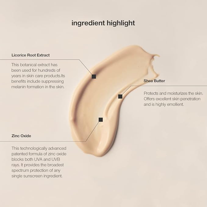 - SUNSCREEN: A lightly-tinted, physical only sunscreen and moisturizer evens out skin tone and boosts radiance while protecting against UVA/UVB rays.