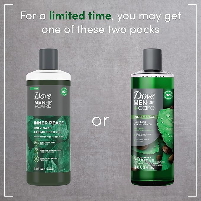Dove Men+Care Body Wash Holy Basil + Hemp Seed Oil 4 Count to Rebuild Skin in the Shower with Plant-Based Cleansers and Moisturizers 18 oz