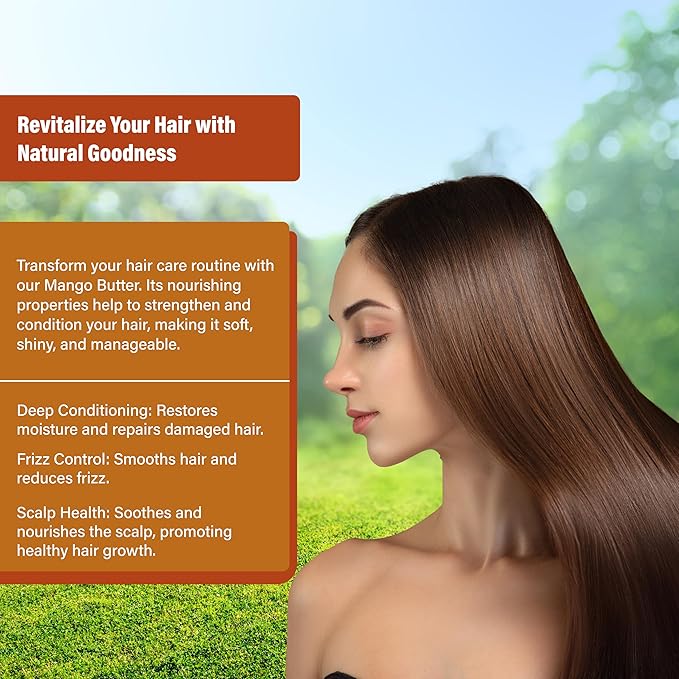- HAIR CARE - Fatty acids in Mango Butter provide essential nutrients that helps both scalp and hair, leading to stronger hair follicles and a reduction in breakage. Rich in vitamins A and E, Mango Butter has a deep moisturizing and regenerative effect on both strands and scalp. It fortifies strands from the inside out, softens dry hair, reduces breakage, and smooths split ends. Locks in moisture to help to prevent scalp irritation and flaking without ever leaving the hair greasy or limp.