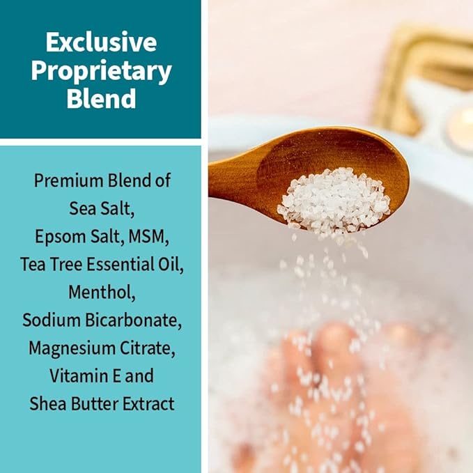 - Exclusive Proprietary Blend: Our foot soak is a premium blend of sea salt, Epsom salt, MSM, Tea Tree essential oil, menthol, Sodium Bicarbonate and Magnesium Citrate. We even added Vitamin E and Shea Butter Extract to make it extra special. After all, your feet deserve the best! No additives, no synthetic dyes or fragrances, no harsh chemicals or other non-natural ingredients.