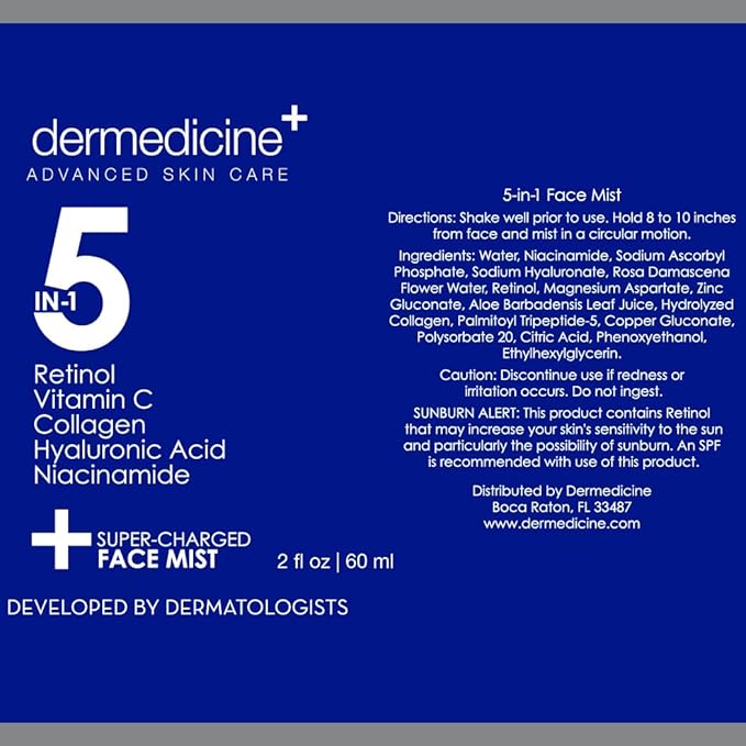 - BRIGHTENS FOR A GLOWING COMPLEXION Our 5 in 1 hydrating face mist contains a blend of active ingredients that work to reveal brighter more youthful-looking skin. This hydrating facial mist works great as a toner spray for your face, neck and chest. Our 5 in 1 face mist is formulated with brightness boosting Vitamin C, Niacinamide, Collagen and Retinol. This Vitamin C facial toner spray works to help improve the appearance of dull, sallow skin to reveal a more radiant-looking complexion.