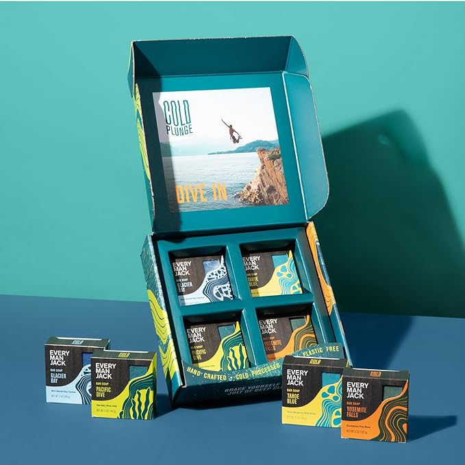 Every Man Jack Cold Plunge Mens Bar Soap Set - Deeply Cleans, Hydrates with Naturally Derived Ingredients - Iconic Cold Water Scents - Pacific Dive, Glacier Bay, Tahoe Blue, Yosemite Falls, 8 Bar Set