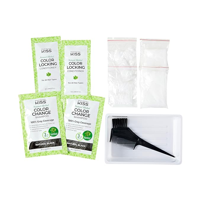 KISS Color Change Permanent Shampoo Dye, 100% Gray Coverage, Natural Plant & Herbal Extracts, All Hair Types, Moustache & Beard, 3-7 Minute Application, 4 Pre-Measured Pouches - Natural Black