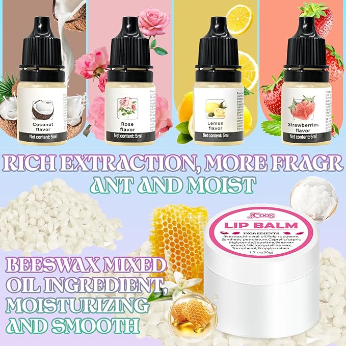 - NATURAL & MOISTURIZING LIP BALMS: Pamper your lips with a professional moisturizing blend of beeswax and various oil. Our diy lip balm makes you feel the smoothness of your lips, and keeps your lips Hydrated all day. JCOOS lip balm making supplies are gentle and nourishing for dry and chapped lips