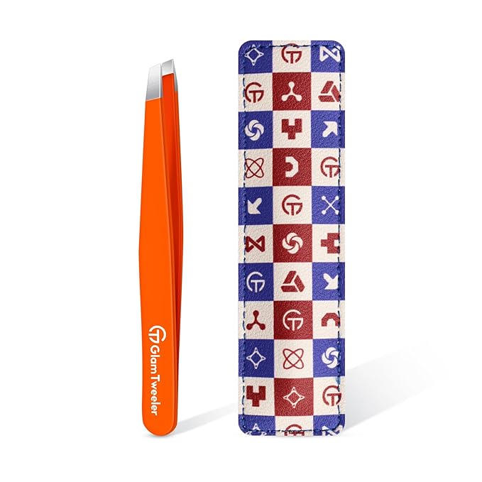 Expert Eyebrow Hair Removal Tweezer with Leather Case, GlamTweeler High Precision Slant Tip Stainless Steel Tweezers for Men and Women (Orange)