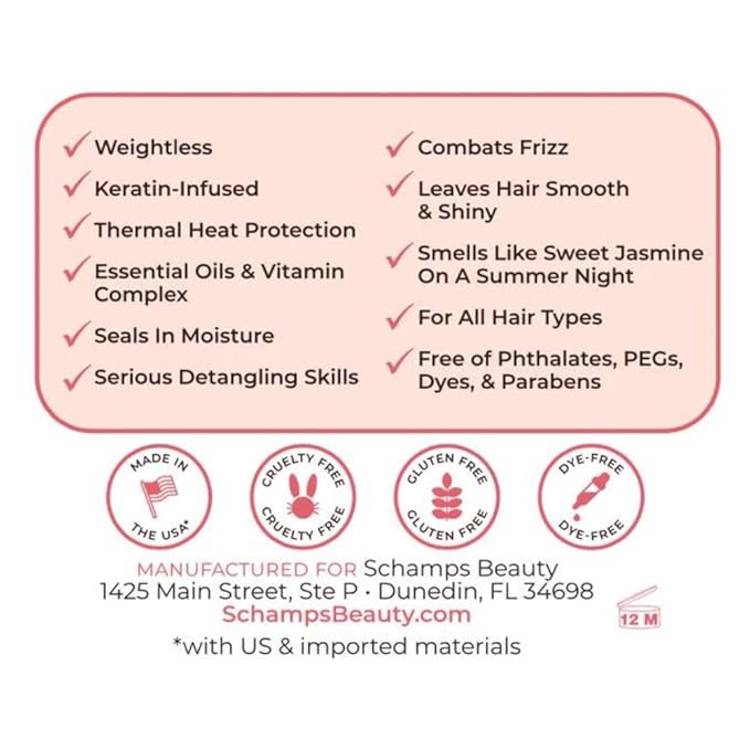 - Product Benefits : Weightless, keratin-infused, convenient leave-in conditioner that smells like sweet jasmine and leaves hair smooth, shiny, and detangled Weightless, keratin-infused, convenient leave-in conditioner that smells like sweet jasmine and leaves hair smooth, shiny, and detangled